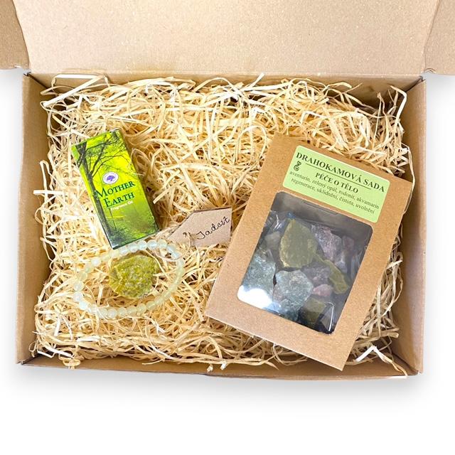 Balíček pro Střelce obsahuje drahokamovou sadu Péče o tělo, vonný olej do aromalampy Matka Země, drahokamový náramek Jadeit, kámen Zelený opál.