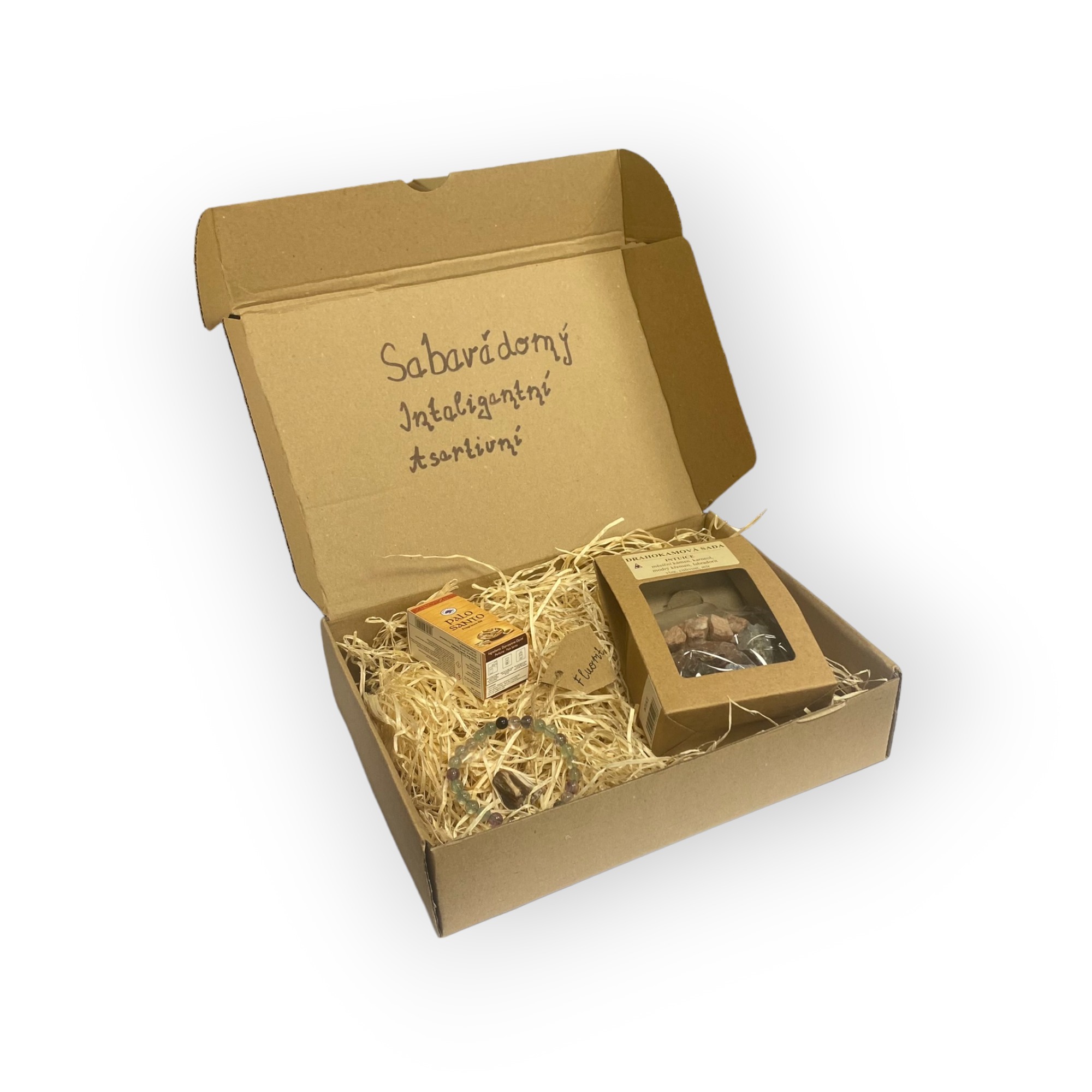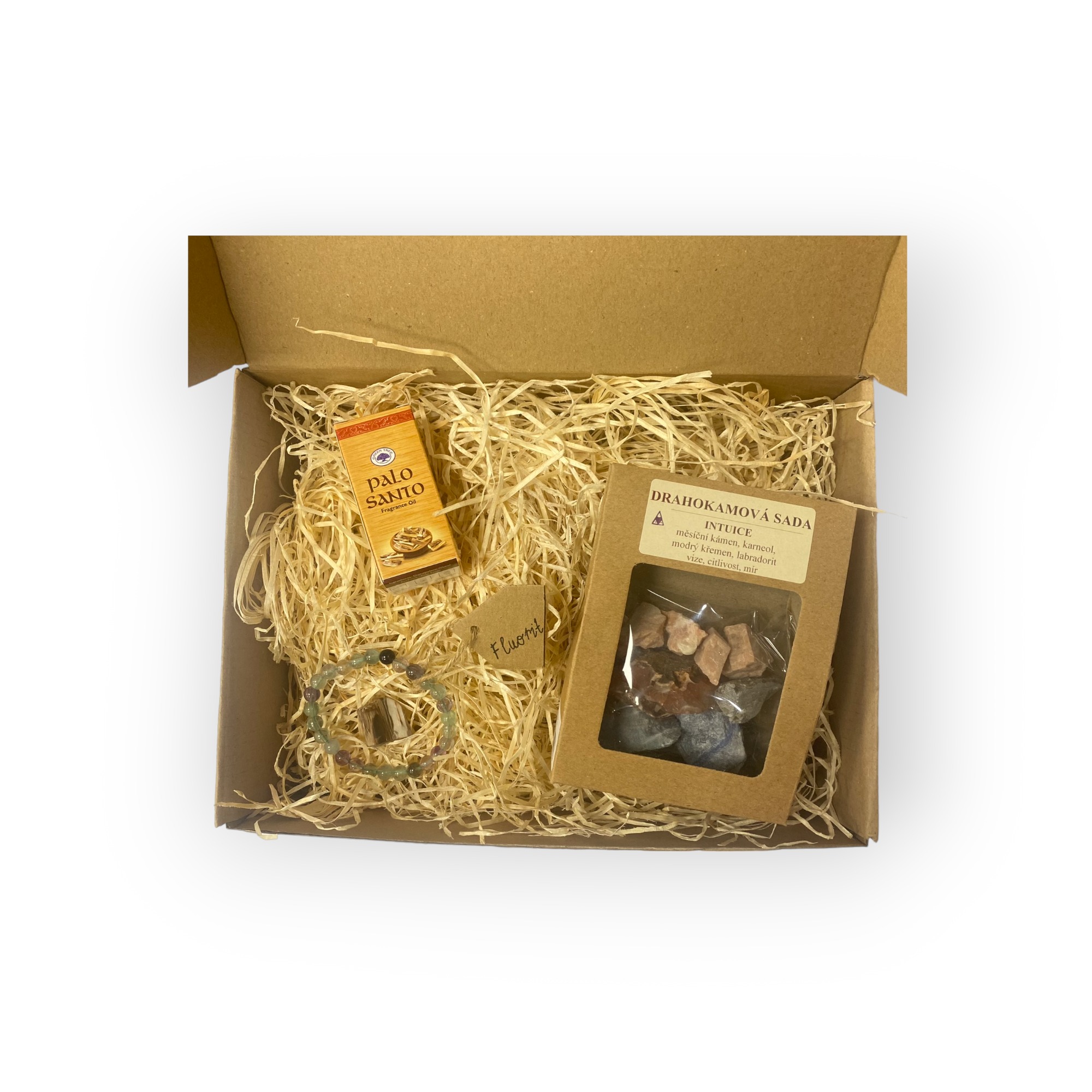 Balíček pro Vodnáře obsahuje: Drahokamovou sadu Intuice, vonný olej do aromalampy Palo Santo, drahokamový náramek Fluorit, kámen Zkamenělé dřevo.