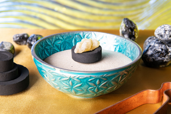Krásná hliníková miska s vyobrazením Květu života. Jednoduše ji naplňte pískem, zapalte uhlík, na něj vložte špetku kadidla a můžete začít s očistou prostoru. Uvnitř i vně misky je vyobrazen Květ života.