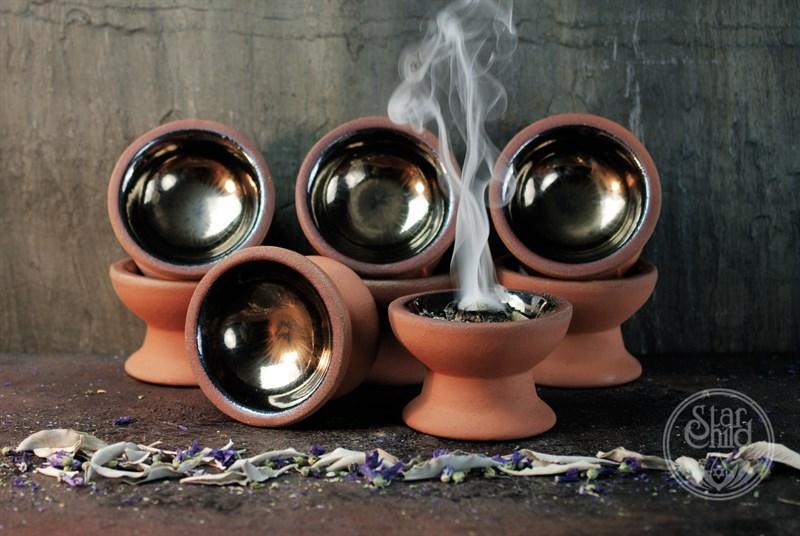 Malá keramická kadidelnice. Je ji možné použít k vykuřování nebo jako svícen čajové svíce. V případě vykuřování doporučujeme používat pod rychlozápalný uhlík písek, který zachytí největší žár.