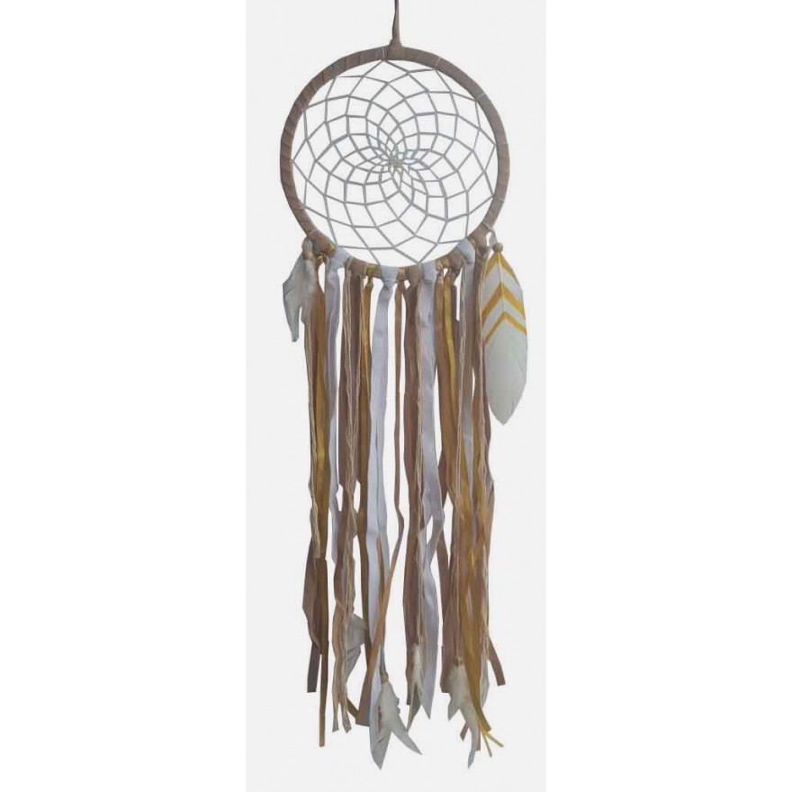 Lapač snů, v přírodní barvě, doplněn o barevné stuhy, kůže a peříčka.