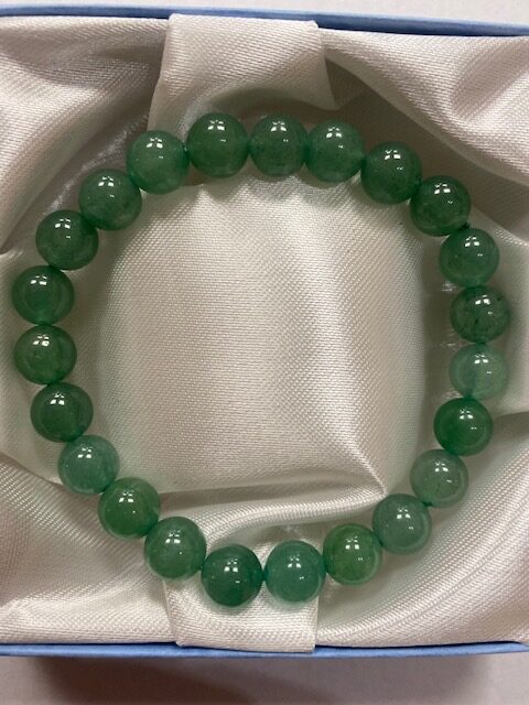 Náramek vyrobený z korálků aventurínu o průměru 8 mm. Kameny jsou vrtané, navlečené na gumičce, díky tomu má náramek univerzální velikost. Každý kamínek je originál, proto se každý náramek může v detailu lišit.