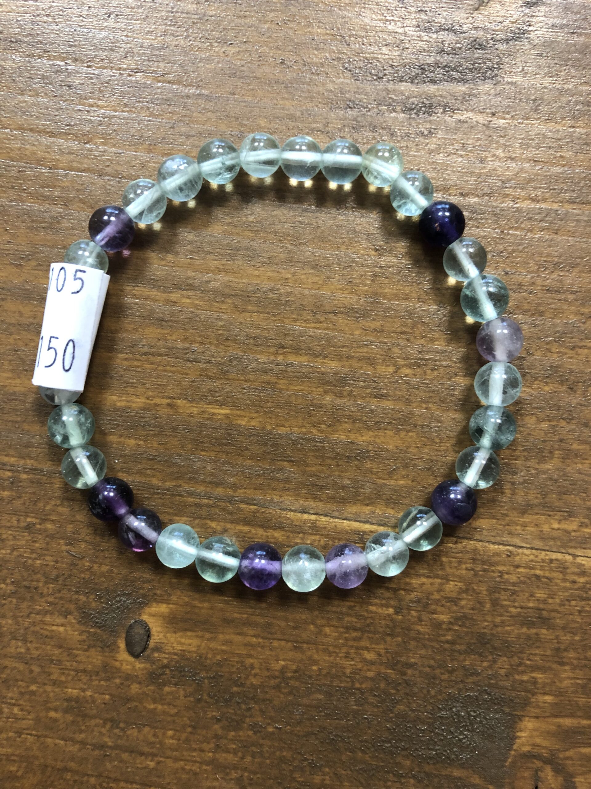 Náramek vyrobený z korálků fluoritu o průměru 6 mm. Kameny jsou vrtané, navlečené na gumičce, díky tomu má náramek univerzální velikost. Každý kamínek je originál, proto se každý náramek může v detailu lišit.