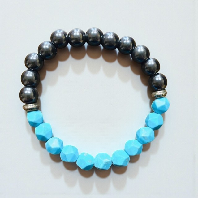 Náramek navlečený na pružné gumičce, kombinace kamínků z hematitu a fazetovaného tyrkysu.