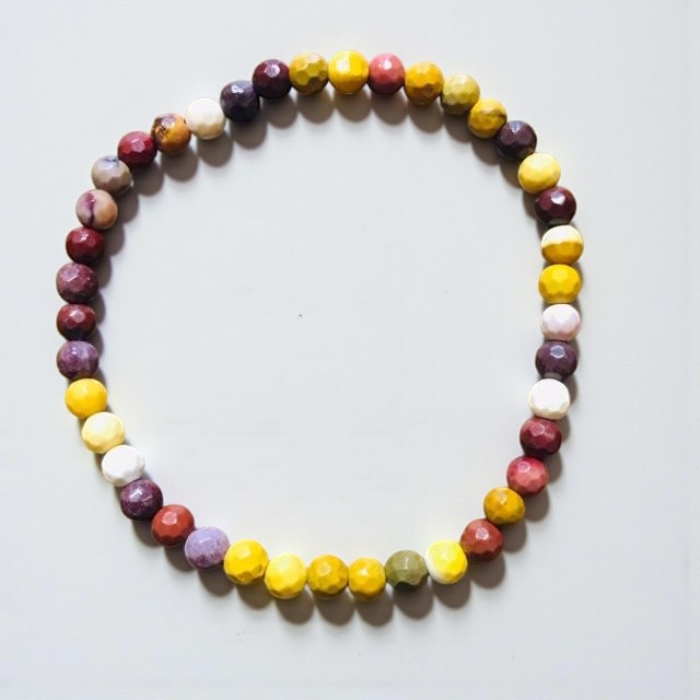 Náramek vyrobený z fazetovaných kamenů mokaitu (jaspisu australského). Kameny jsou vrtané, navlečené na gumičce. Každý kamínek je originál, proto se každý náramek může v detailu lišit.