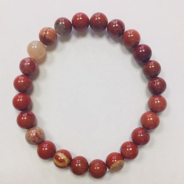Náramek vyrobený z kamínků jaspisu. Kameny jsou vrtané, navlečené na pružné dvojité gumičce. Každý kamínek je originál, proto se každý náramek může v detailu lišit.