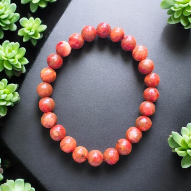 Náramek z korálu, navlečen na pružné gumičce.