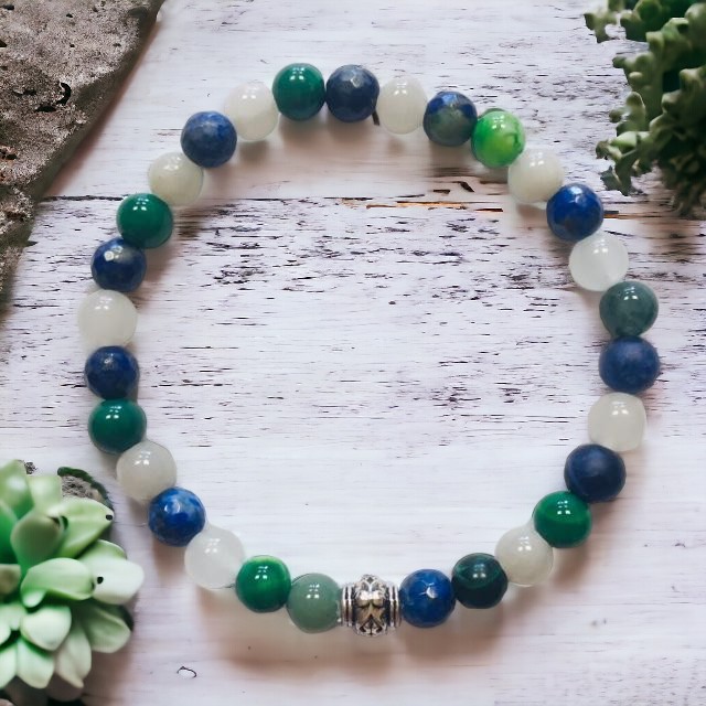 Elegantní ručně navlékaný náramek na pružné gumičce, kombinace křišťálu, sodalitu a achátu.