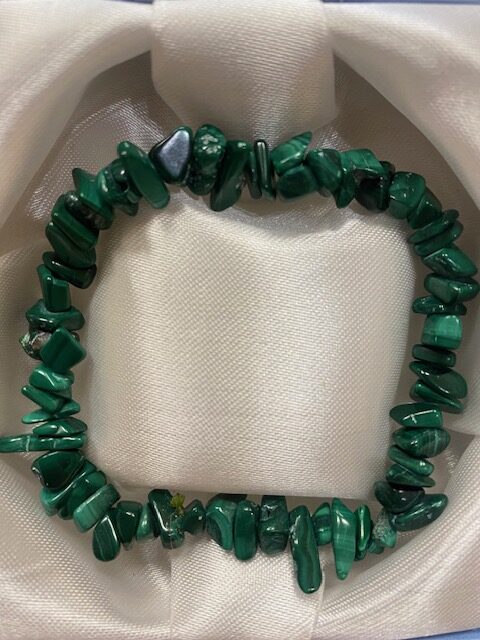 Náramek vyrobený ze sekaných kamínků malachitu o velikosti 6 mm. Kameny jsou vrtané, navlečené na gumičce, díky tomu má náramek univerzální velikost.