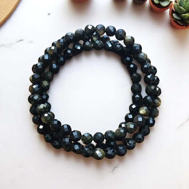 Náramek z kamínků fazetovaného obsidiánu zlatého o velikosti 6 mm, navlečený na pružné dvojité gumičce.