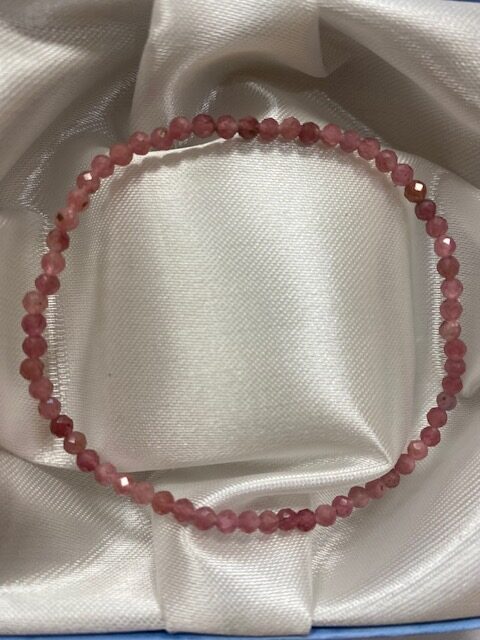 Náramek vyrobený z fazetovaných korálků rubelitu o průměru 3 – 4 mm. Kameny jsou vrtané, navlečené na pružné gumičce. Každý kamínek je originál, proto se každý náramek může v detailu lišit.