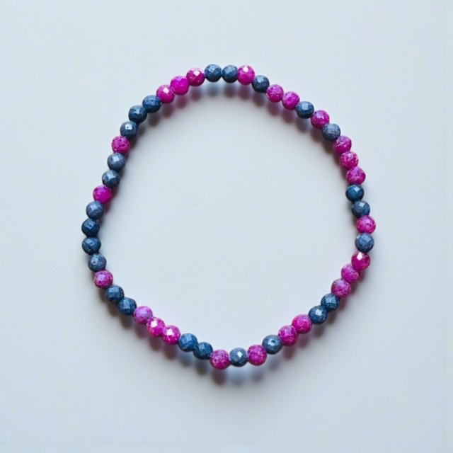 Náramek vyrobený z fazetovaných korálků rubínu a safíru o průměru 4 mm. Kameny jsou vrtané, navlečené na pružné dvojité gumičce. Každý kamínek je originál, proto se každý náramek může v detailu lišit.