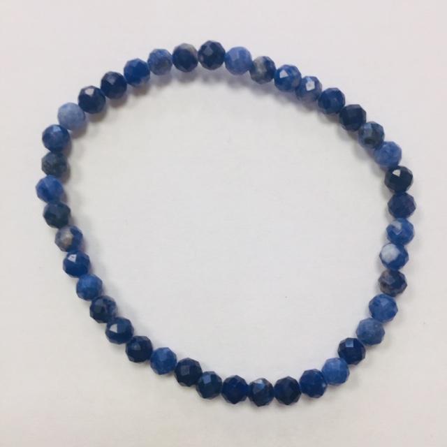 Náramek vyrobený z fazetovaných korálků sodalitu o průměru 4 mm. Kameny jsou vrtané, navlečené na pružné dvojité gumičce. Každý kamínek je originál, proto se každý náramek může v detailu lišit.