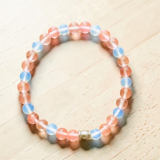 Elegantní ručně navlékaný náramek na pružné gumičce, kombinace třešňového křemene a opalitu.