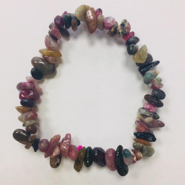 Náramek vyrobený ze sekaných korálků turmalínu melounového. Kameny jsou vrtané, navlečené na pružné gumičce. Každý kamínek je originál, proto se každý náramek může v detailu lišit.