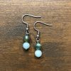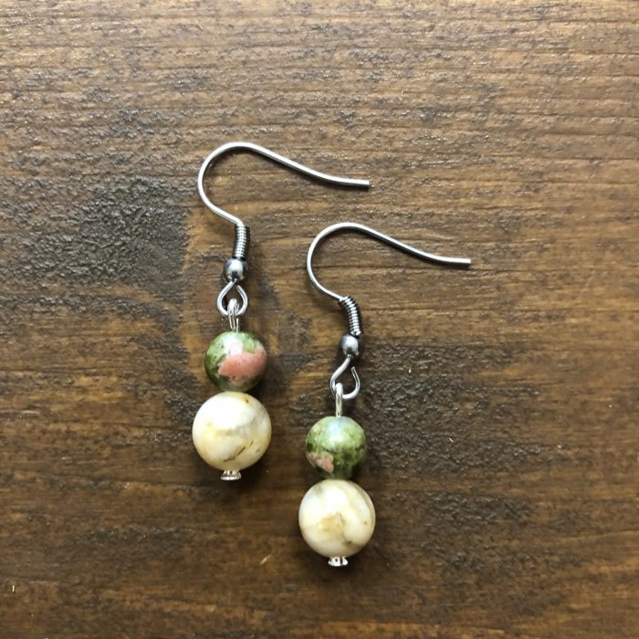 Náušnice z chirurgické oceli v kombinaci slunečního kamene a unakitu se závěsným zapínáním.