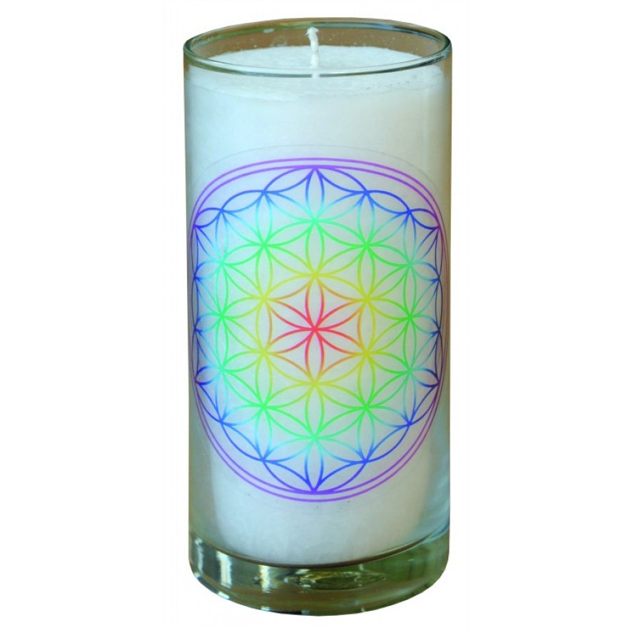 Nádherná skleněná svíčka v bílé barvě, vyrobena ze stearínu (obnovitelná, biologicky rozložitelná surovina z rostlinných olejů), se symbolem Květu života. Samolepka se symbolem Květu života je nalepena na skleněném obalu svíčky, po vyhoření zůstává na skle. Možno použít opakovaně pro další svíčku, průměr skla cca 6 cm.