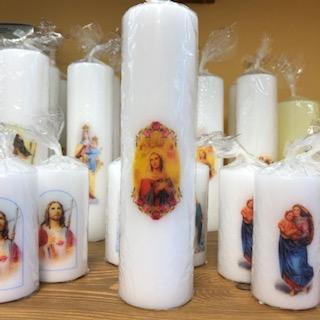 Bílá svíce s vyobrazením Panny Marie.