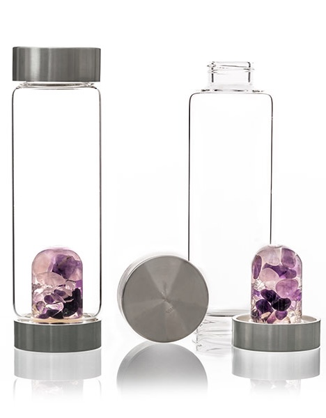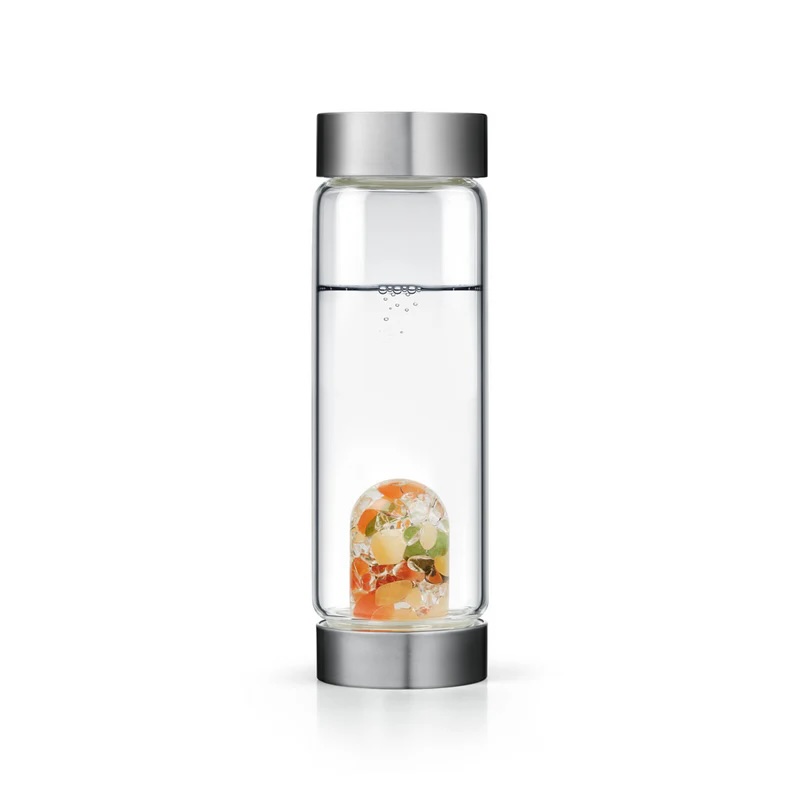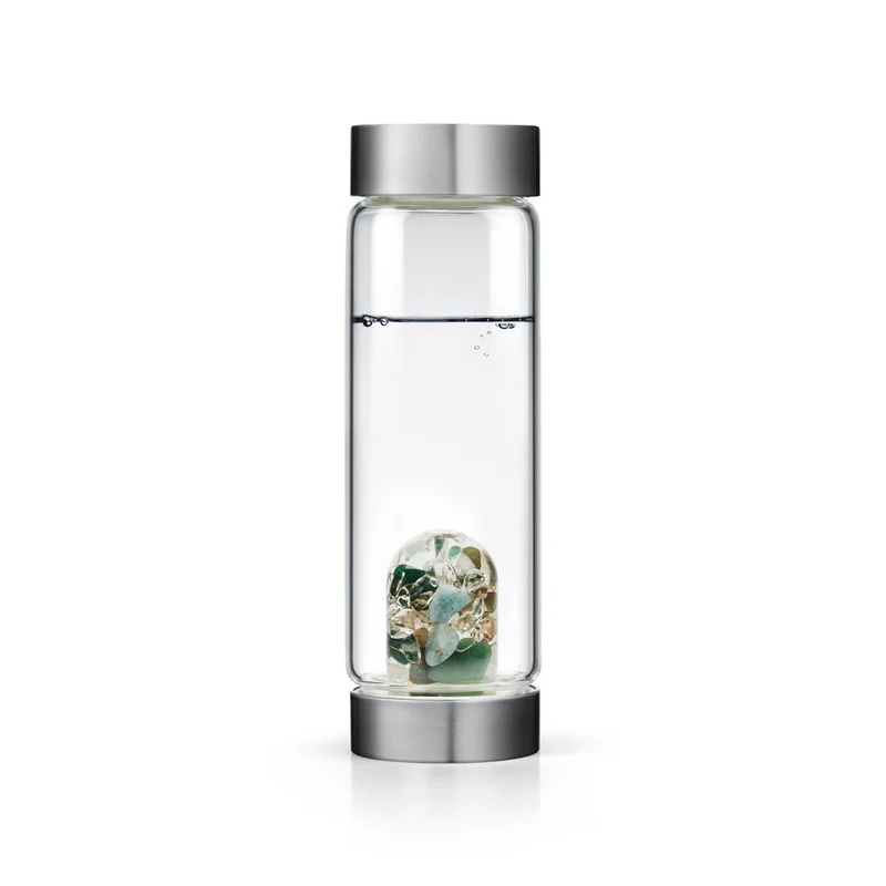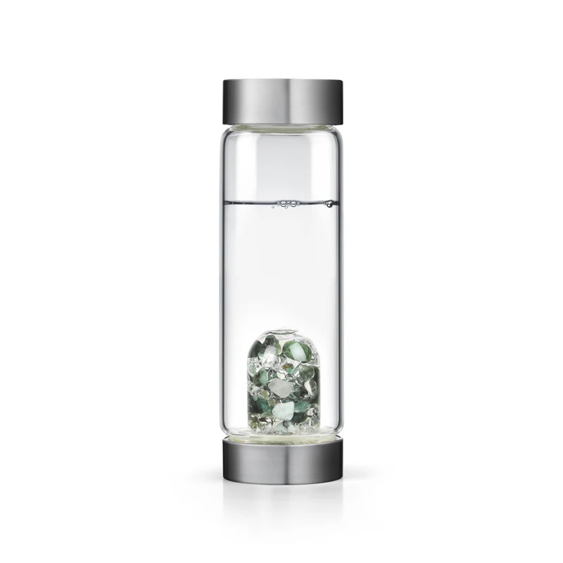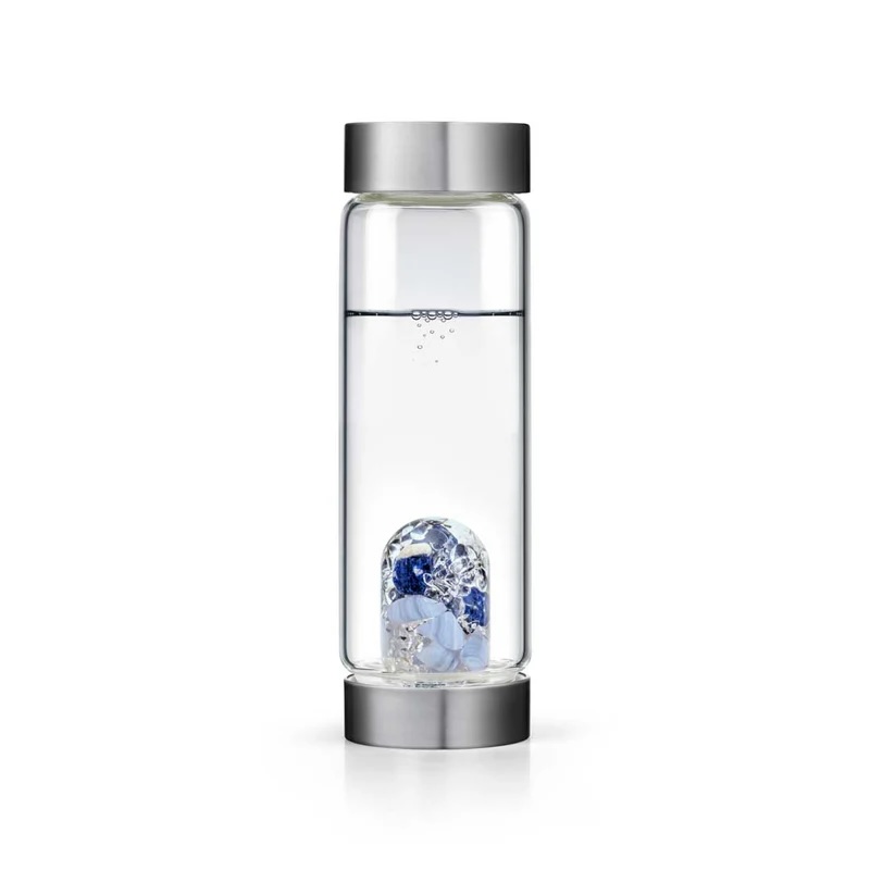 Prémiové borosilikátové sklo bez toxických těžkých kovů, víčka z nerezové oceli, silikonové těsnění BPA free, bezpečný drahokamový modul.